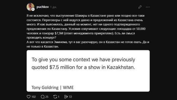 Что касается концерта Эминема, то, как отметил Пучков, артист в настоящее время не рассматривает возможность выступления в Казахстане.
