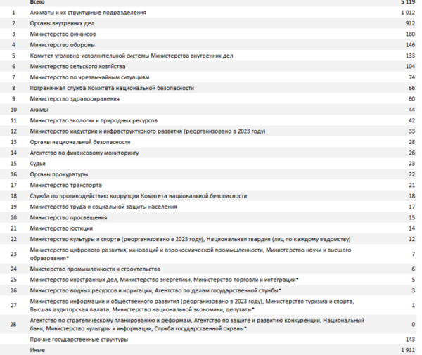Лидерами антирейтинга стали акиматы и их подразделения: за шесть лет к ответственности привлекли свыше тысячи чиновников, включая 44 акима. По оценке Finprom, это может быть связано с тем, что на местном уровне сосредоточены ключевые ресурсы — бюджет, земельные вопросы и другие управленческие полномочия.