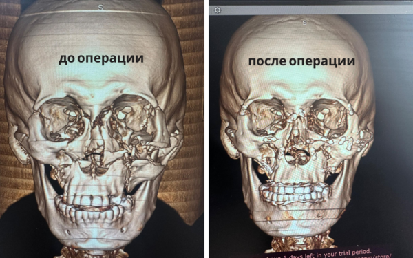 В условиях специализированного отделения была выполнена экстренная операция – открытая репозиция и остеосинтез костей лицевого черепа, включая восстановление анатомического положения верхней челюсти и элементов скуло-орбитального комплекса. Оперативное вмешательство было направлено на стабилизацию костных структур, восстановление функций дыхания и жевания, а также предотвращение возможных осложнений.